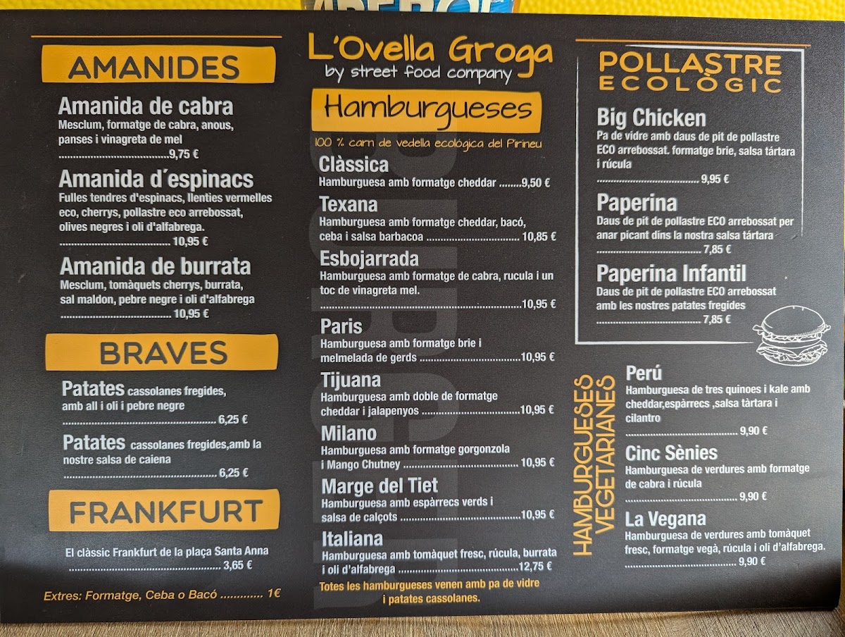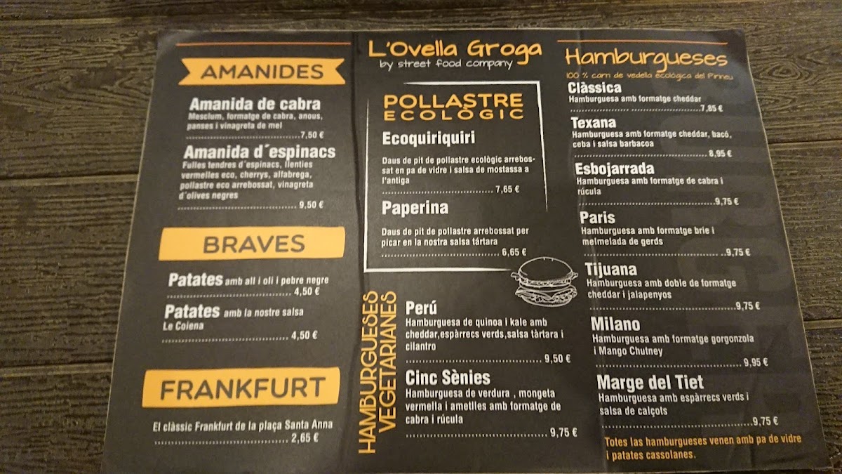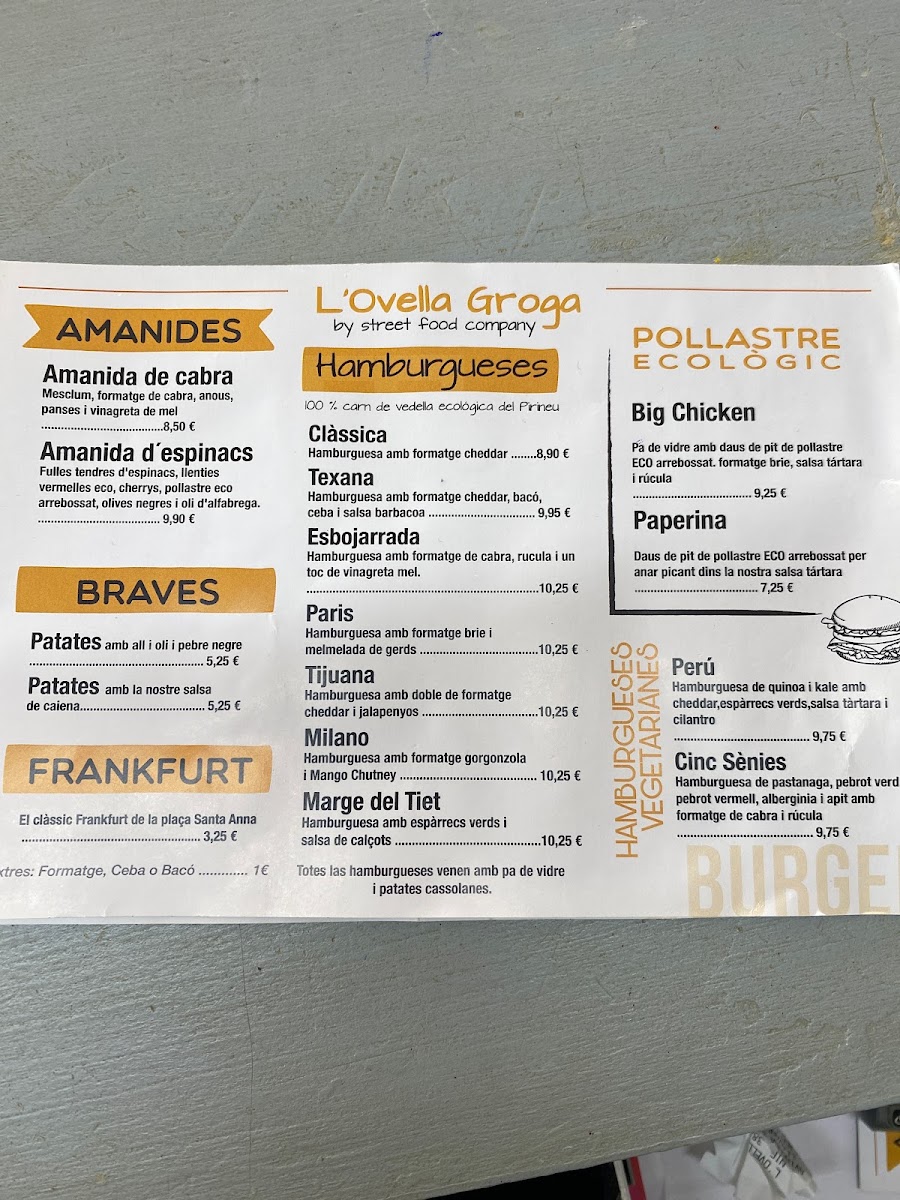 Welcome to L’Ovella Groga, a hidden gem nestled in Sant Andreu de Llavaneres, Barcelona. This vibrant restaurant celebrates the art of simple yet delicious cuisine, featuring a menu that’s both inviting and thoughtfully crafted. The star attraction? Their vegetarian burgers! The Hamburguesa Perú, made with quinoa and kale, tantalizes with its cheddar and green asparagus, while the Hamburguesa Cinc Sènies, a delightful blend of vegetables and goat cheese, truly delights. If you're craving light meals, try the Amanida de Cabra or Amanida d'espinacs, which burst with fresh flavors. For a crunchy start, the Patates braves add a perfect kick. Guests rave about the friendly atmosphere and the cozy space for families, making it an exceptional spot to enjoy quality organic ingredients. Have a savory experience in a place where simplicity meets sophistication. Forget fast food—L’Ovella Groga is where quality reigns!